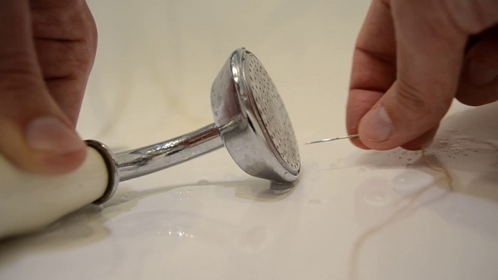 Если поверхность лейки получится очистить при помощи разнообразных щеток, например, зубной, то с мелкими отверстиями форсунок дела обстоят намного хуже из-за их размера. Хороший вариант – вооружиться иглой. Лучше всего брать инструмент, который будет максимально близким по размеру к отверстию. Если не соблюсти это условие, могут возникнуть проблемы: слишком толстая игла не пройдет, а чересчур тонкая не сможет до конца очистить лейку.