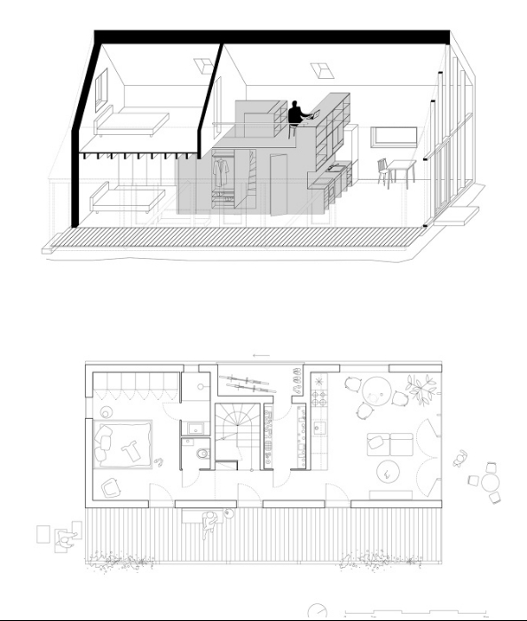 Интересное решение: Для увеличения полезной площади дом разделили на два уровня, при этом оставили открытую планировку, чтобы в любую из комнат или уединенный уголок проникал дневной свет, и жильцы могли любоваться природным пейзажем. Чтобы не загромождать жилое пространство мебелью и лишними перегородками, на нижнем уровне установили модульный блок, который и помог организовать несколько функциональных зон. Вместительный модуль, сделанный из дерева и фанеры, вмещает в себя лестничный пролет, ванную комнату, туалет, гардеробную, кладовую и является частью конструкции кухонного гарнитура, который сделали из обычной фанеры. Впрочем, как и вешалку у входа, и открытый стеллаж для книг и различных мелочей, и шкафчики с рабочим столом, которые установили на втором уровне.