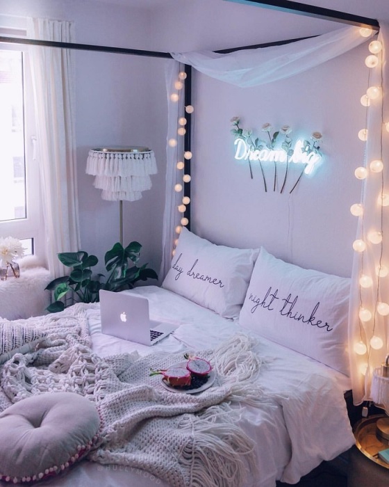 По традиции, гирлянды начинают распутывать в декабре, когда до Нового Года остается еще несколько недель, но уже хочется создать праздничное настроение. А вот в повседневной жизни их используют достаточно редко, считая неуместными. Но вспомните, как уютно сидеть вечером у окна, украшенного десятками маленьких теплых огоньков, и пить горячий какао с маршмэллоу, мечтая о чем-то своем. Так почему нужно ждать зимы, чтобы создать в квартире подобнуб атмосферу? Предлагаем использовать гирлянды в качестве постоянного декора для спальни. Включайте их вечером и наслаждайтесь сказочной обстановкой, которая возвращает мысли в детство, навевает приятные воспоминания и вызывает улыбку. А еще можно обновить стены. Вот 7 идей, как быстро покрасить стены своими руками не хуже профессионального маляра