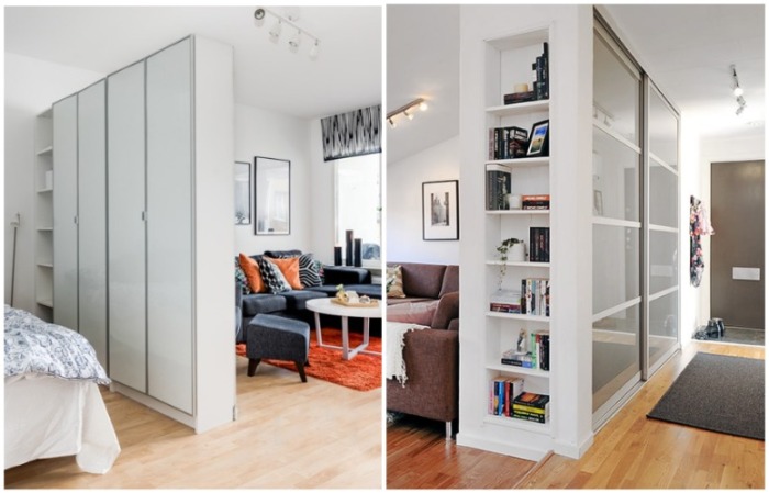 Более функциональным вариантом зонирования станет высокий шкаф. В отличие от того же стеллажа, без которого прекрасно обходятся жители среднестатистических квартир, шкаф является поистине незаменимым предметом мебели. Если использовать его для разделения комнаты, доступ к вещам будет только с одной стороны, а вот вторую смело можно декорировать зеркальными панелями – такой прием визуально расширит вторую зону. Дверцы шкафа уместно будет расположить со стороны спальни, а вот зеркало – со стороны гостиной.