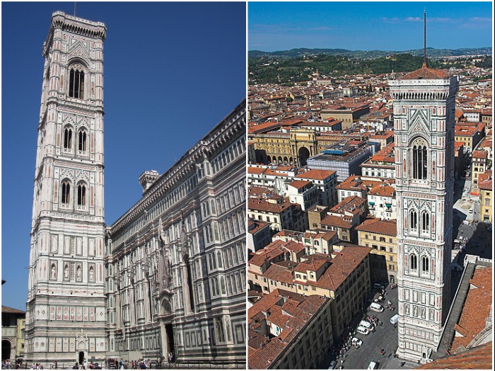 Кампанила Санта-Мария дель Фьоре спроектирована Джотто ди Бондоне по законам обратной перспективы (Флоренция).