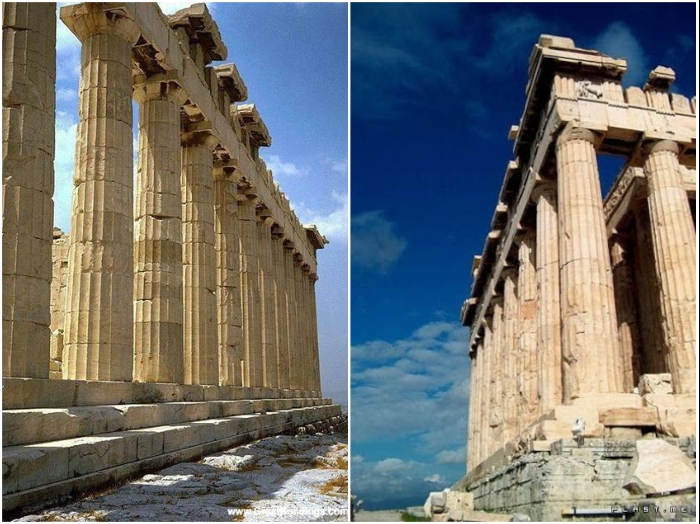 С колоннами пришлось повозиться не меньше. Зная о воздействии света на восприятие человеческого глаза, они рассчитали, что угловые колонны всегда будут освещены ярким небом Эллады, а вот остальные – видны лишь на темном фоне самого храма. Чтобы избежать зрительного уменьшения размеров угловых столбов, их сделали немного шире чем остальные, также их разместили ближе к соседним. Благодаря этому приему удалось сгладить иллюзию «истончения» крайних опор и создать иллюзию одинакового расстояния между колоннами. Если же заняться измерением каждой из последующих опор, то окажется, что они также видоизменены, причем нарушений пропорций и прямых линий, добавление утолщений или создание уклонов могло быть несколько на одном элементе.