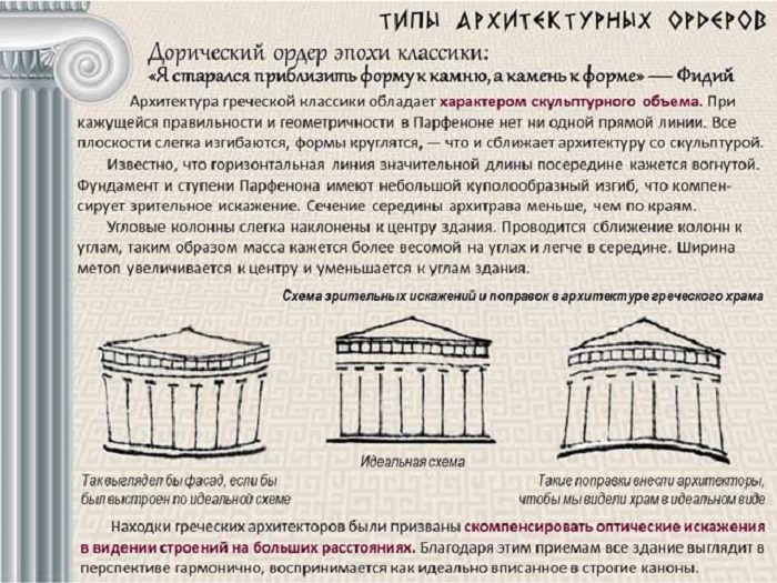 Горизонтальная балка заужена к центру, чтобы компенсировать зрительные иллюзии (Парфенон, Афины). С помощью подобных средств иллюзорной компенсации удалось достичь правильного восприятия вертикальных и горизонтальных прямых, которые кажутся совсем не параллельными, если имеют значительную длину. Горизонтальную балку (архитрав), например, которая размещается на капителях колонн, по центру сделали более узкой, чем по краям, но издали она кажется абсолютно ровной. Чтобы опоры получились более стройными и ровными, их чуть «заваливали» относительно основания. Мало того, что эта хитрость помогла выдержать идеально ровные углы и линии для человеческого восприятия, так еще конструкция становилась более цельной и прочной.