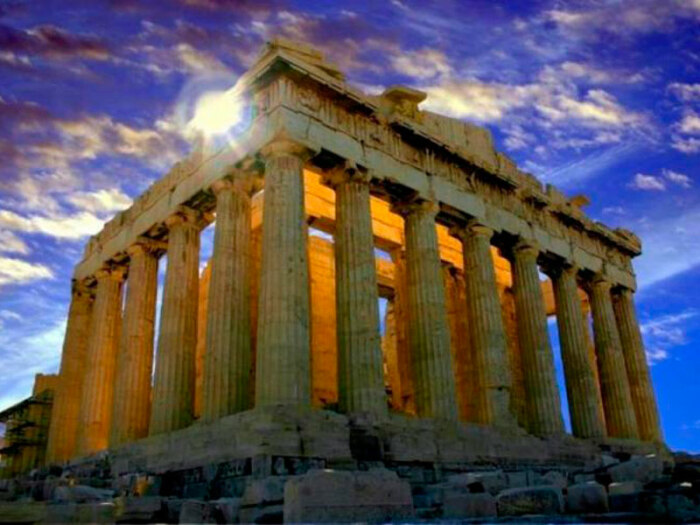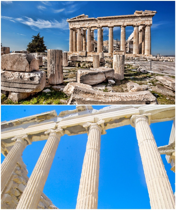 Чтобы Парфенон выглядел более впечатляющим и высоким, колонны к верху заузили. | Фото: connection-people.com. Чтобы здание казалось выше и создавалось впечатление устремляющегося в небо храма, колонны заузили к верху. Для «борьбы» с иллюзией вогнутости массивных опор их попросту утолщали приблизительно на уровне нижней трети ствола. Это средство компенсации называется «энтазис» (от греч. entasis — напряжение, усиление).