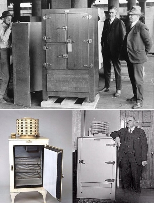 Один из первых компрессионных холодильников Frigidaire и пример серийного бытового холодильника General Electric.