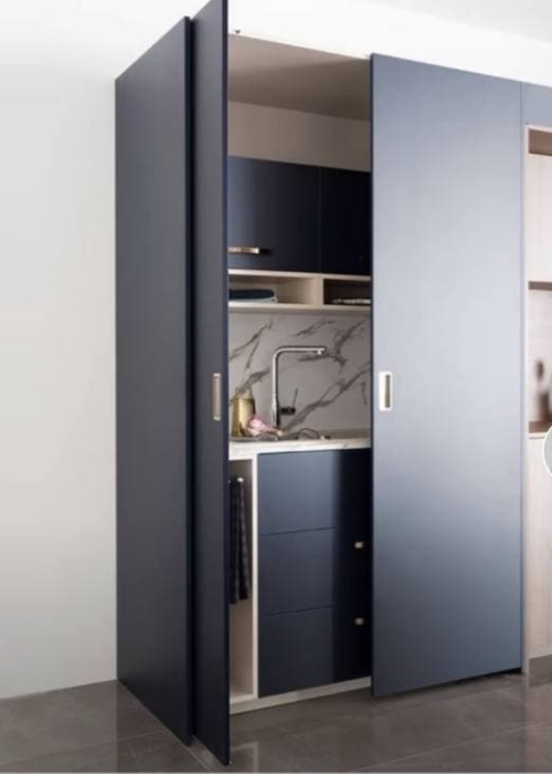 Скрытая кухня – это кухня, которая спрятана за декоративными стеновыми панелями, раздвижными или распашными дверьми или дверьми-гармошками. Такой способ позволяет замаскировать как всю кухонную технику, так и беспорядок на кухне. Кроме того, скрытая кухонная секция помогает сохранить единый стиль интерьера. Это особенно актуально и удобно для квартир-студио, где кухня объединена с гостиной и не имеет отделяющей её стены.