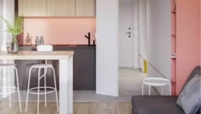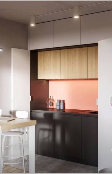 Распашные двери-гармошки для скрытия кухонной секции, опять же, экономят место. За счёт того, что гармошек две, экономится место, которое так важно сохранить для небольшой квартиры, в то время как распашные двери требуют много пространства.