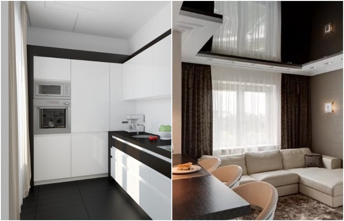 • выделит зону – если в квартире открытая планировка, глянцевый или матовый черный потолок поможет визуально разделить комнату на гостиную, кухню и кабинет, не прибегая к различным перегородкам.