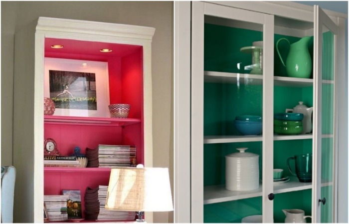 Точнее, не весь шкаф, а только его заднюю стенку. У многих возникнет вопрос: зачем красить эту часть гарнитура, если она скрыта от посторонних глаз? Дело в том, что стенка тоже влияет на восприятие собственного жилья и даже на настроение. Представьте, что вы заходите на кухню, открываете шкафчик с посудой, а внутри не стандартная белая стенка, а, например, зеленая или синяя. У вас сразу появляется улыбка на лице, ведь сердце радуется приятным переменам. А если дверцы шкафа стеклянные, яркая стенка будет привлекать внимание, даже когда гарнитур закрыт.