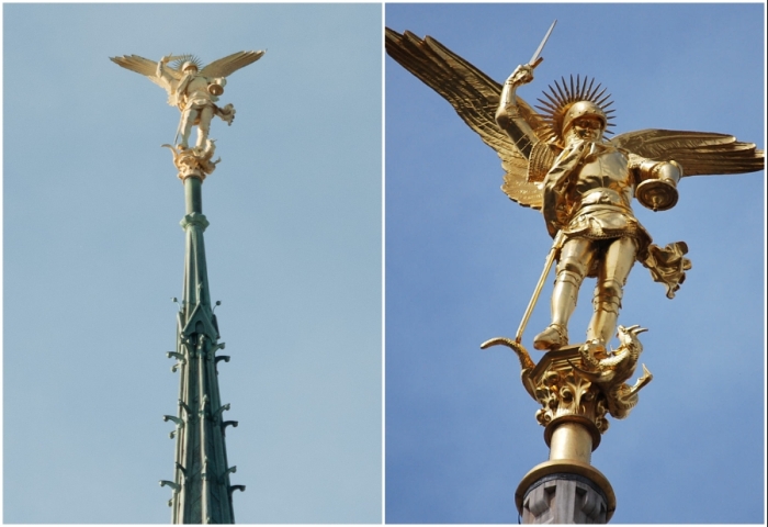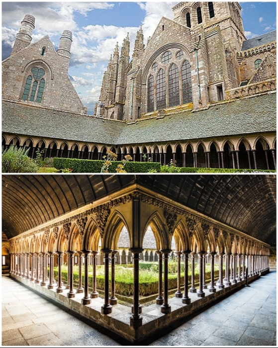 Если посмотреть на Мон-Сен-Мишель с точки зрения архитектуры, то можно сказать, что весь уникальный ансамбль создан в лучших традициях романского и готического стиля с присущим им величием и монументальностью, устремленной ввысь. Взять хотя бы главный храм, расположенный на самой вершине скалы и увенчанный шпилем, взметнувшимся ввысь на 155,5 м с золоченой фигурой Архангела Михаила (его вес составляет 820 кг!). Именно 3,5-метровую статую, зависшую между небом и землей, чаще всего можно увидеть на путеводителях и фотоальбомах страны, которая по праву считается самым узнаваемым символом Франции. А вот сами монахи-бенедиктинцы говорят, что их храм связывает между собой «Землю, Мир людей и Небеса».