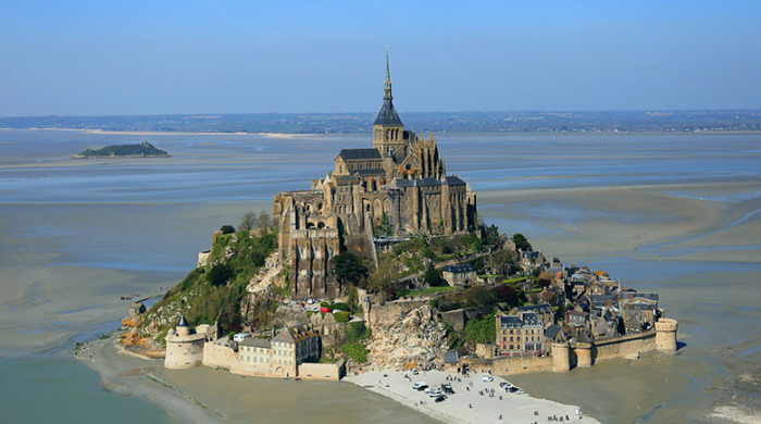 Интересный факт: В те времена, когда кельты и друиды устраивали на этой скале свои святилища, она находилась в окружении живописных лесов. Но три реки, впадающие в Ла-Манш в этом месте, сделали свое дело, и со временем 80 метровой высоты утес оказался окруженный водой. Но постоянства и в этой природной стихии не оказалось. Приливы и отливы стали настолько частыми гостями (два раза в лунные сутки через 24 часа 50 мин.), что потоки воды, иногда поднимающие гигантскую волну высотой до 14 метров, затапливали внушительную территорию до 20 км вглубь побережья. В период приливов остров Мон-Сен-Мишель оказывался полностью отрезанным от большой земли. Это уникальное природное явление с одной стороны помогло сберечь крепость и аббатство в целости и сохранности, ну а с другой стороны – несказанно усложнило задачу строителям и зодчим. Не одно столетие людям приходилось работать в нечеловеческих условиях, чтобы мир увидел уникальную архитектурную сокровищницу, которая хранит массу историй и легенд, начиная с первых дней ее существования. Издревле это священное место окутано мистической атмосферой. Кельты, например, скалу использовали для захоронений и называли ее Могильной горой, а у друидов здесь было «Святилище Дракона». Также существует легенда, что в недрах Могильной горы в золотом гробу покоится тело самого Юлия Цезаря.