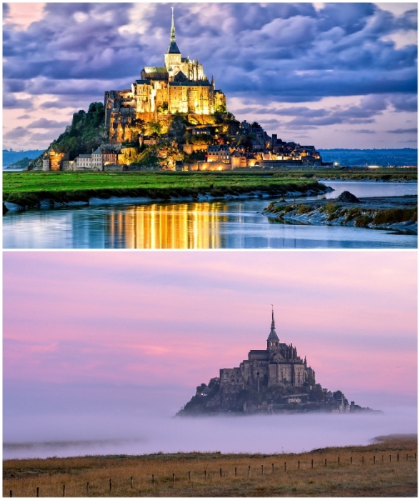 Особенно восхитительно аббатство на острове выглядит в вечернее время и в туманные дни (Мон-Сен-Мишель, Франция).