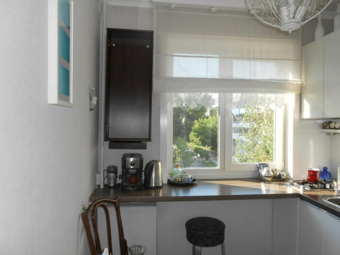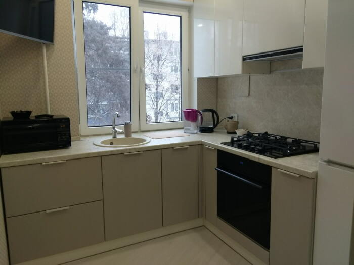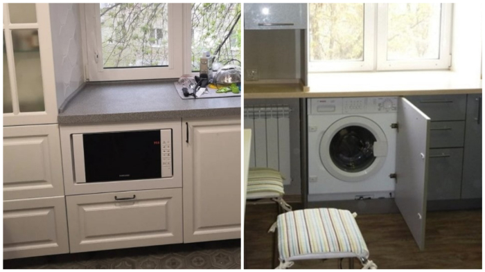 Это может быть стиральная машина, ведь вопрос её размещения в маленькой квартире всегда стоит остро. Отдайте предпочтение узкой модели и поместите её под подоконник. Второй вариант - посудомойка. Освободившийся проем под окном может открыть возможность размещения встраиваемой посудомойки с красивым фасадом. В оставшееся пространство можно установить небольшой шкаф для хранения моющих средств. Ещё отличный вариант - духовка. Главное, чтобы техника была электрической и подходила по размеру.