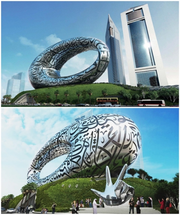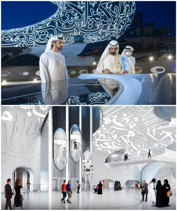 В Дубае завершилось строительство уникального во всех отношениях Музея будущего (Museum of the Future), который признан произведением архитектуры и высшим достижением инженерии. Футуристическое здание музея сложной формы было создано из стекловолокна, карбона и нержавеющей стали. Особенно впечатляющим получился «Глаз Дубая», внешняя оболочка которого состоит из 1020 инновационных облицовочных панелей. Сливаясь воедино, они создают покрытие украшенное арабской вязью, цитирующей строки из поэмы правителя Шейха Аль-Мактума.