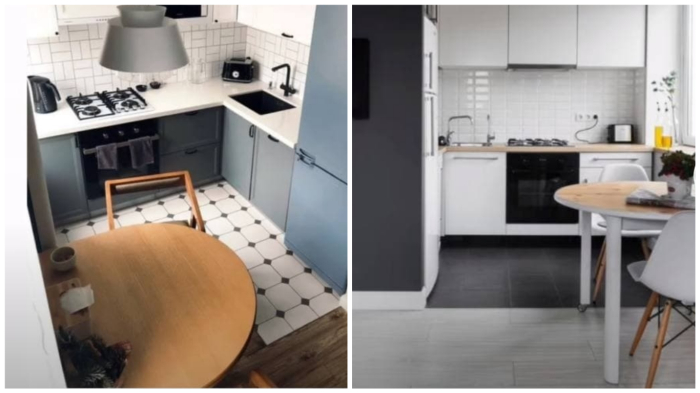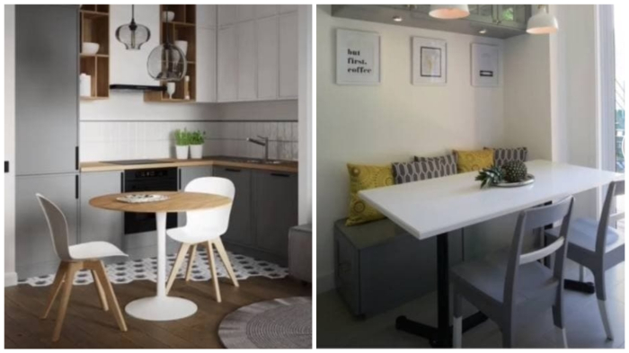 Начнём с того, что прямоугольный стол в маленькой кухне чреват постоянными синяками на ваших бедрах. Это неприятно и травмоопасно. Во-вторых, круглый стол более мобилен и, как ни странно, даже в углу занимает меньше места.