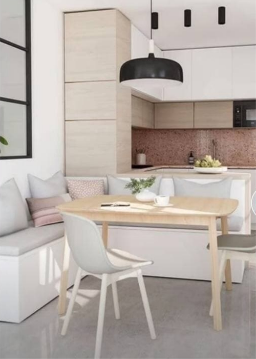 Чтобы увеличить количество посадочных мест за столом в маленькой кухне, отличным решением будет минималистический угловой диванчик для отдыха или угловая банкетка.