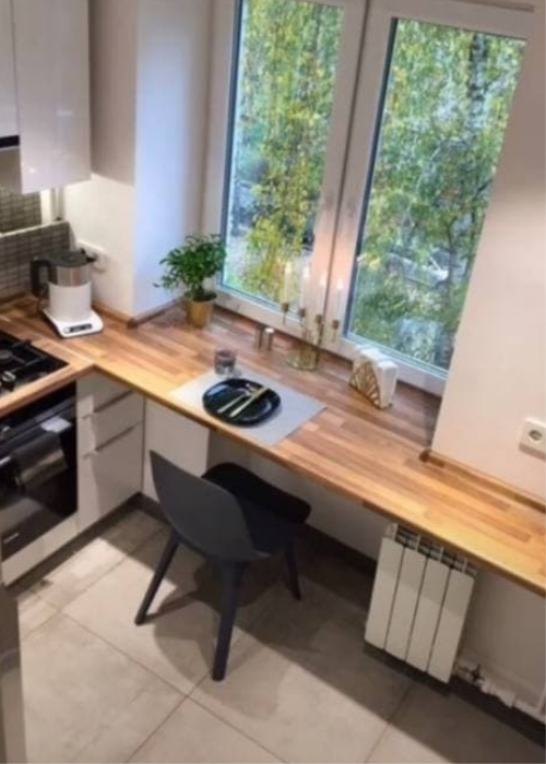 Стол как продолжение подоконника экономит кучу места на кухне и очень необычно смотрится. Это топовый тренд в интерьере современных студио в скандинавском стиле на сегодняшний день.
