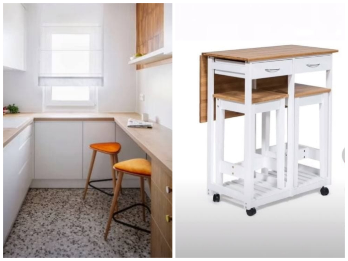 Откидные и выдвижные столы для маленькой кухни в студио.