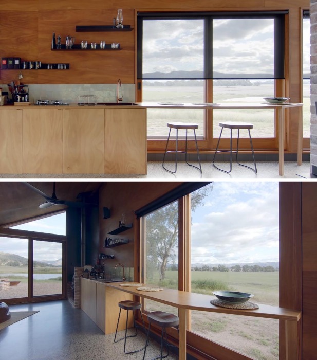 Барная стойка у окна станет прекрасным местом и для принятия пищи, и для общения, и для наблюдения за сельским пейзажем (Gawthornes Hut, Австралия).