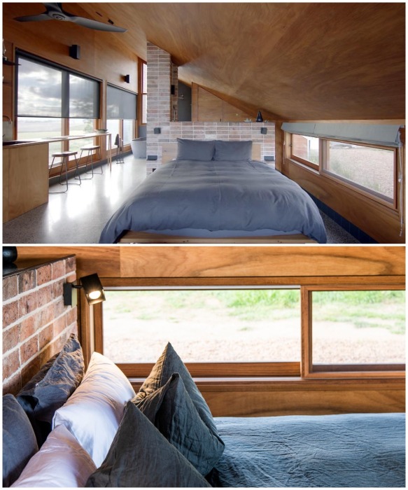 За гостиной расположена зона для сна с большой кроватью у окна (Gawthornes Hut, Австралия).
