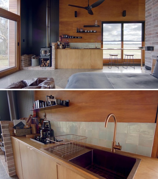 Полностью оборудованная кухня даст возможность наслаждаться кулинарными изысками из натуральных продуктов (Gawthornes Hut, Австралия). Как ни странно, но кухня расположена рядом с кроватью, что не совсем удобно, если отдыхать будет пара с разным биологическим ритмом. Тем не менее кухонная зона укомплектована всем необходимым для приготовления разнообразных блюд: двухкомфорочной плитой, работающей на пропане, мойкой, шкафом и холодильником. В продолжение рабочей поверхности сделана барная стойка, рассчитанная на двоих. Она будет использоваться лишь в непогоду, в остальные дни для принятия пищи более подходящим местом станет крытая терраса, на которую есть прямой выход из гостиной или зона барбекю.