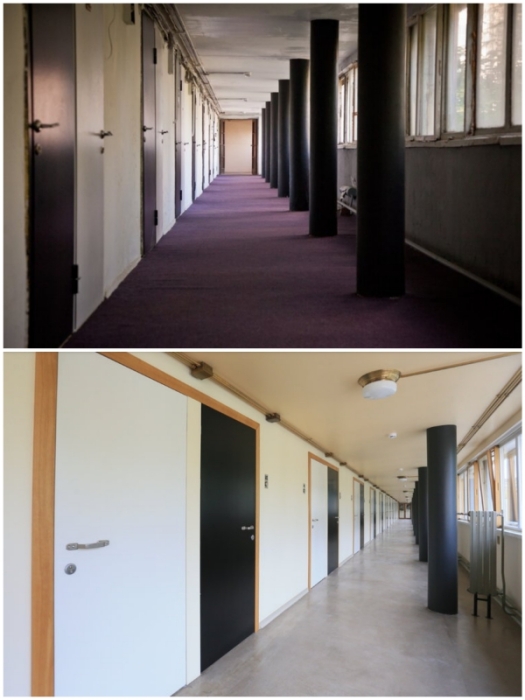 Длинные коридоры с квартирами-ячейками в «Доме Наркомфина».