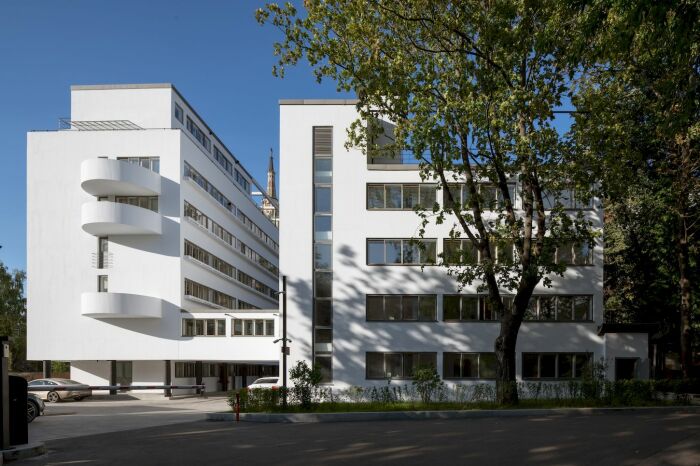 После современной реконструкции здание не только сохранило исторический облик, но и идеально вписалось в городской пейзаж («Дом Наркомфина»). | Фото: engineer-history.ru.