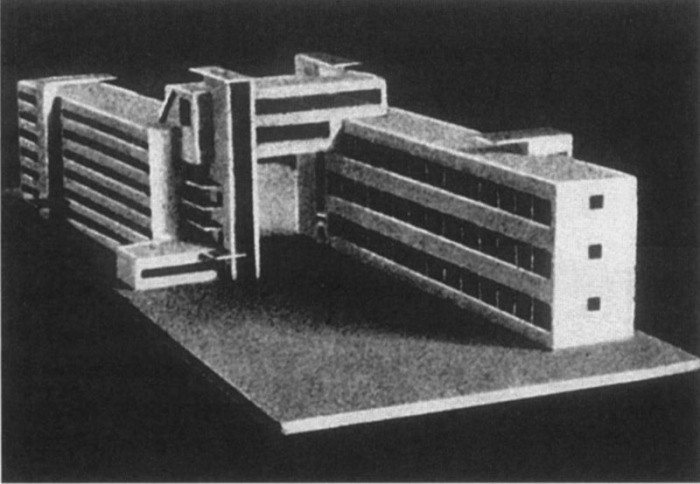 А вот полное отсутствие некоторых зон должно было компенсироваться благоустроенными общественными пространствами, которые организовывались в отдельном корпусе. Общая столовая, прачечная, зона отдыха, спортивный зал на крыше здания, детский сад, чтобы работники не тратили время на доставку отпрысков в дошкольные учреждения, собственная библиотека и гараж – все это должно было «стимулировать переход на более высокую форму социально-бытового уклада».