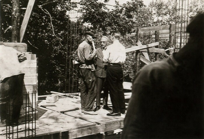 Моисей Гинзбург на строительстве «Дома Наркомфина» (Москва). | Фото: thecharnelhouse.org.