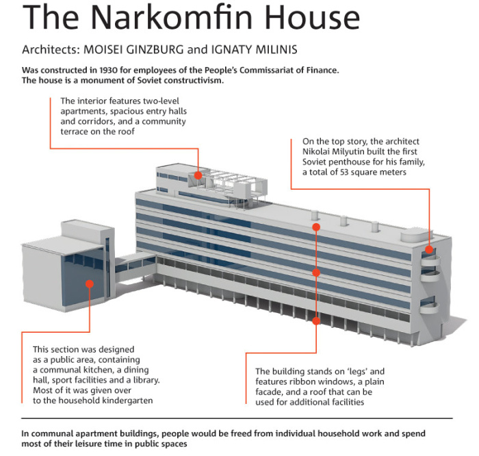 Справка: «Дом Наркомфина» на Новинском бульваре, 25 в Москве был построен в рамках экспериментального многоквартирного жилищного строительства в 1928-1930 гг. Автором шедевра конструктивизма и авангардизма стал Моисей Гинзбург, который попытался обеспечить постепенный переход от мещанства к счастливой советской жизни. Честь оказаться первыми жителями уникального дома выпала работникам Наркомата финансов СССР в далеком 1930 году. Именно они должны были освободиться от кухонного рабства и избавиться от необходимости стирать вручную. Также им предоставлялась возможность пристроить ребенка в детский сад, записаться в библиотеку или позаниматься спортом, не выходя за пределы дома.