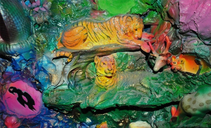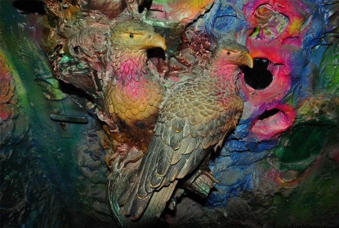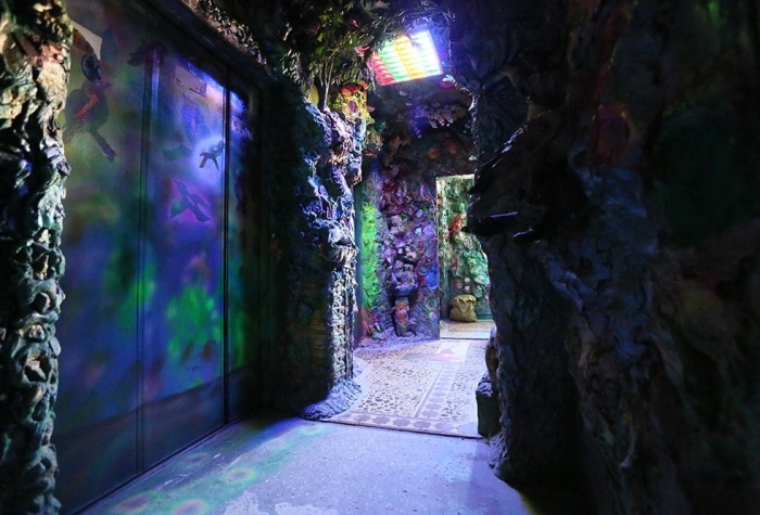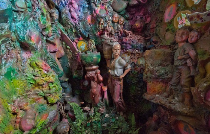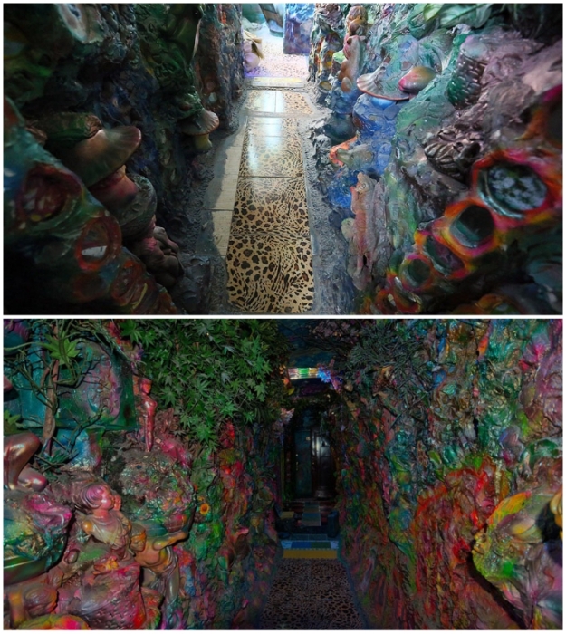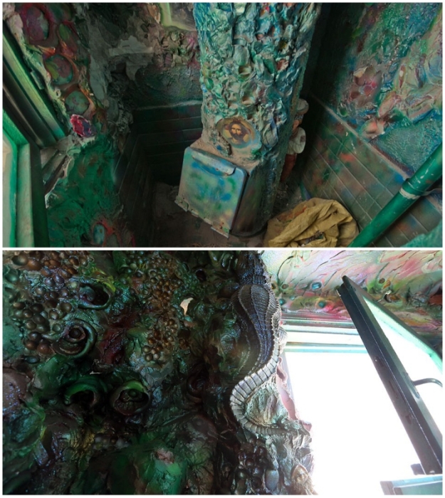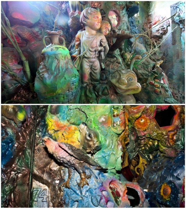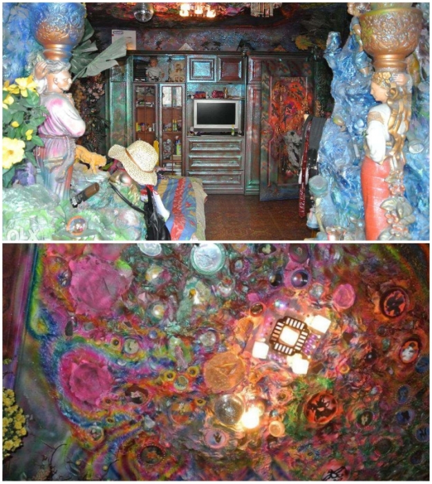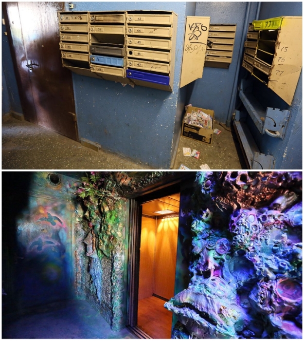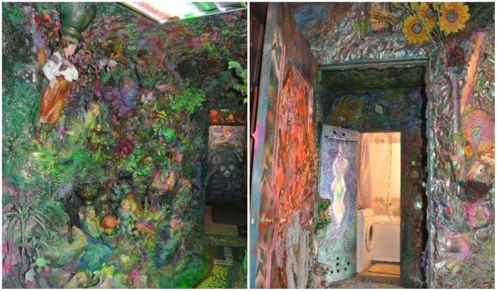 Чаще всего подъезды многоквартирных домов – еще то зрелище, а в некоторые бывает даже страшно входить. Но это не касается одного неприметного дома на Троещине (Киев), одна из лестничных площадок которого за последние годы превратилась в местную достопримечательность. А «виновником» такой популярности стало необычное увлечение украинской художницы, украсившей свою квартиру холл и лестничный пролет этажа фантазийными скульптурами из разноцветных камушков, детских игрушек, безделиц и лепки с использованием 50 тонн цемента.