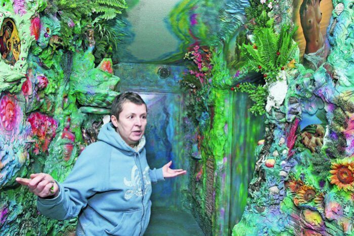 Большинству жителей постсоветского пространства не нравится жить в старых многоэтажных домах, где стены подъездов «украшены» в лучшем случае трещинами и облезлой краской, но мало кто задумывается о том, чтобы изменить такое положение вещей. При этом когда кто-то решит кардинально поменять интерьер подъезда, многие тут же начинают принимать начинания в штыки. Как это произошло в Киеве, где в одной из многоэтажек на улице Радунской жительница квартиры на 13 этаже начала создавать фантастические скульптуры из различных камней, осколков стекла, элементов детских игрушек и статуэток.