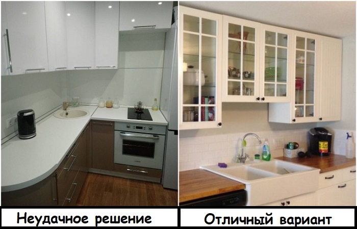 Здесь все просто – глянцевые поверхности отражают свет, а потому комната автоматически становится более просторной. Чаще всего этот прием применяют в дизайне маленьких кухонь, заказывая глянцевые фасады. Однако результат получается совсем не таким, как мы представляем изначально. В крохотной комнате обилие глянца и сверху, и снизу лишь давит со всех сторон. Плюс он является абсолютно не практичным – на таких поверхностях сильно видны пятна, разводы от воды, отпечатки пальцев, пыль и пр. Как вариант – сделать только нижние шкафы глянцевыми, а верхний ярус заменить экземплярами с прозрачными дверцами или открытыми полками. Обратите внимание, что во втором случае комната будет выглядеть более легкой, воздушной и просторной, однако убирать на кухне придется гораздо чаще и дольше.