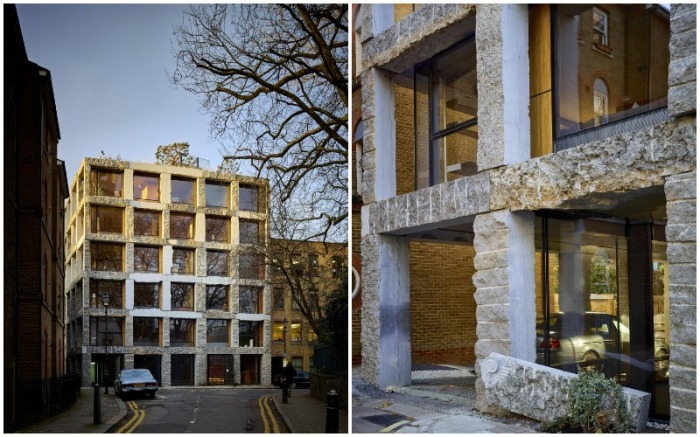 Необычное здание с огромными окнами и облицовкой из «необработанного» известняка вызывает жаркие споры (15 Clerkenwell Close, Лондон).