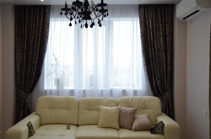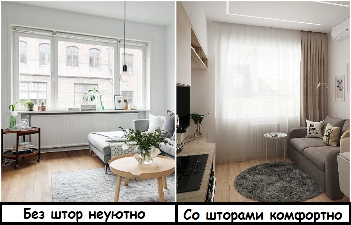 Лучше использовать светлые занавески, которые не будут препятствовать естественному освещению, но в то же время скроют «содержимое» квартиры от посторонних глаз. Также стоит обращать внимание на длину штор – они должны чуть-чуть не доставать до пола, примерно на два сантиметра. Некоторые дизайнеры советуют, чтобы свободная драпировка лежала на ковре, однако это абсолютно непрактично.