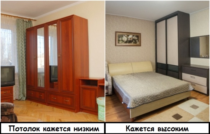 Обычная высота среднестатистического шкафа составляет примерно 2100 см. То есть до потолка еще остается много места. Подобные модели, несмотря на свою популярность, имеют много недостатков. Во-первых, они урезают высоту любой комнаты, а если речь идет о хрущевках, в которых потолки и так низкие, то ситуация получается плачевная. Во-вторых, на шкаф вечно хочется что-то положить – чемодан, сезонные вещи, ненужные книги и журналы – в результате чего со временем он превращается в свалку. В-третьих, мебель зачастую смотрится в спальне несуразно и портит продуманный интерьер.