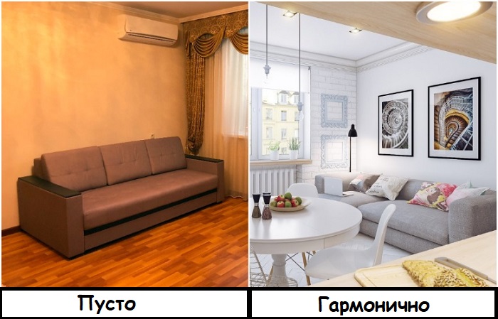 Часто, стараясь не перегружать пространство, мы оставляем стены голыми. И это является одной из главных ошибок, ведь пустые поверхности зачастую делают только хуже. Конечно, десятками маленьких фотографий или картин стены украшать не стоит. А вот выбрать несколько крупных полотен или даже зеркал в рамах и повесить их на уровне глаз будет хорошей идеей. Таким образом вы сможете создать необходимое ощущение свободного пространства.