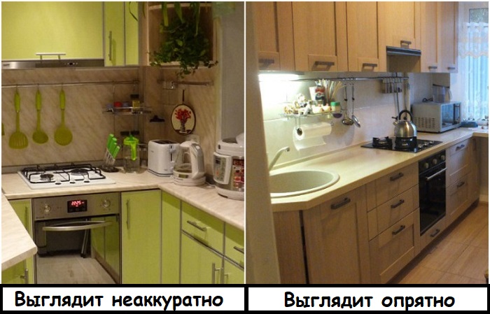 Примерно такая же ситуация обстоит с кухней. Чем больше посуды, девайсов, емкостей для сыпучих находится на виду, тем захламленнее и неряшливее выглядит комната. Плюс, она значительно уменьшается в размерах, что тоже не идет на пользу. Поэтому определитесь, какие принадлежности всегда должны быть у вас под рукой, и оставьте их на столешнице, а все остальное уберите в ящики. Понятно, что в процессе готовки может понадобится все и сразу, но старайтесь после использования сразу прятать всю утварь на место, чтобы на кухне был порядок.