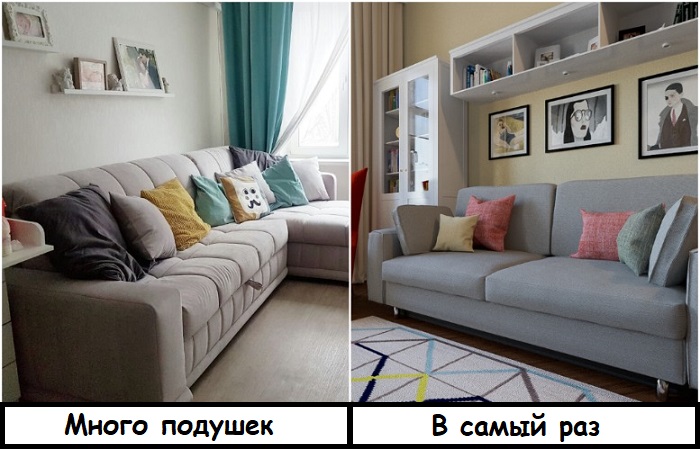 Точнее их избыток. Для придания целостности интерьерной композиции декоративные подушки необходимы, так как они добавляют красоты и уюта. Но если с ними переборщить возникает ощущение хаоса. Помните, что подушка не должна быть слишком большого размера, в идеале – помещаться под спину. А еще вы должны иметь возможность свободно располагаться на диване, а не ютиться на краешке из-за того, что декор занял все свободное место.