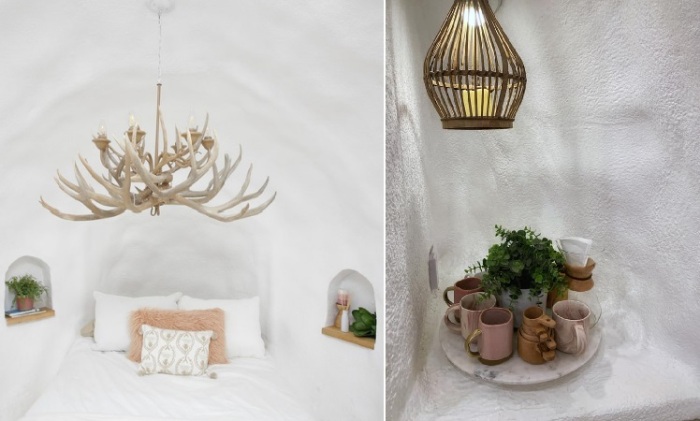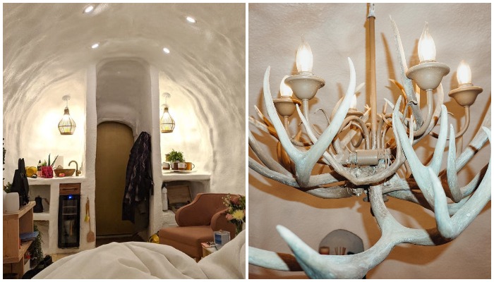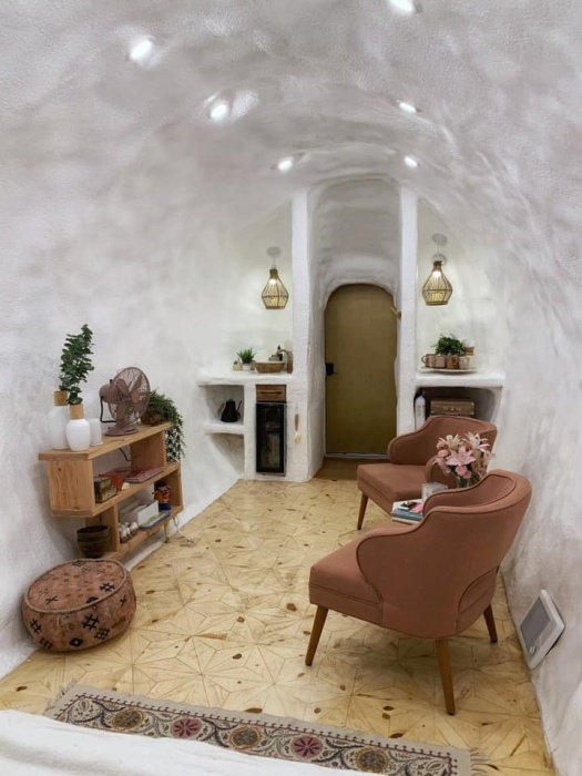 Гостиная зона находится в центре номера-корнеплода, габариты которого позволили установить два мягких кресла, журнальный столик, мягкий пуф для ног и небольшой открытый стеллаж. Поскольку номер повторяет форму картофелины, то окон в нем не предусмотрено. Их заменяют оригинальные люстры и встроенные светильники, а вот комфортную температуру поддерживают с помощью особой системы кондиционирования.