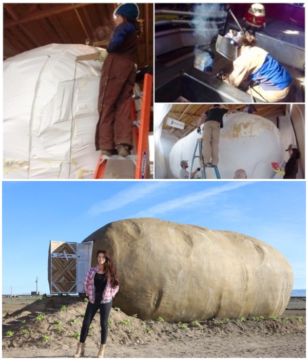 Креативной девушке, которая уже не первый раз занималась преобразованиями и обустройством экзотических пространств, пришлось немало потрудиться, чтобы превратить корнеплод в пригодное для жизни убежище. Поскольку оболочка картофелины была сделана из стали и полая внутри, то не составило труда разрезать ее на несколько частей, чтобы создать тепло- звукоизоляцию, без которой жилое пространство оборудовать бы никак не получилось. Этой работой занималась бригада специалистов и производилась она на местном заводе, после чего готовые элементы были доставлены в поле и закреплены на пригорке с помощью бетона.
