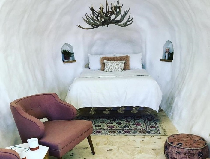 После того, как основные отделочные работы были сделаны, оставалось обустроить гостевой домик, получивший говорящее название Big Idaho Potato Hotel. Хотя он и называется отелем, но состоит всего из одного номера, площадь которого не превышает 30 кв. м. В дальнем конце картофелины решили оформлять спальню, где поместилась большая кровать, парочка ниш и люстра, сделанная из настоящих рогов оленя. Завершающим штрихом для создания домашнего уюта стал шерстяной ковер, который является самым ярким элементом всего интерьера.