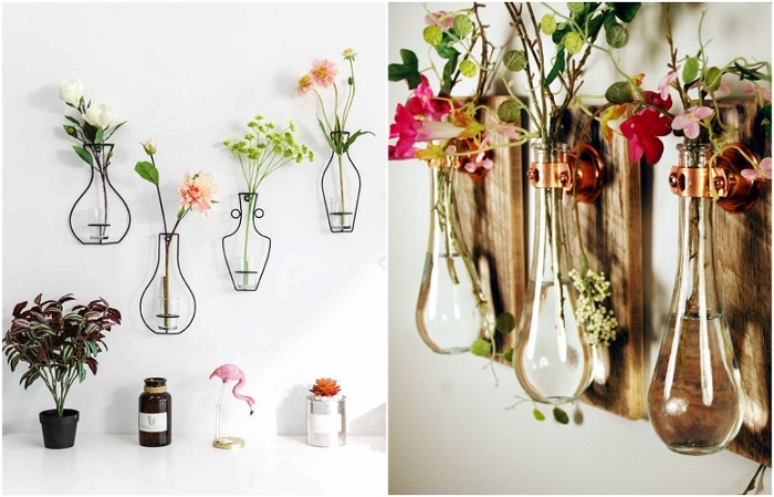 Еще один классный вариант для декора пустых стен предложила Кайла Рамос. Он подойдет для тех людей, которые хотят чем-то украсить поверхность, но покупать предметы искусства пока не планируют. Итак, вам понадобятся искусственные или засушенные цветы, декоративные листья либо ветки. Закажите в интернете несколько стеклянных пробирок, затем, используя термопистолет, приклейте кусочек пробки к стенке каждой колбы и закрепите каждую вазу к стене на двусторонний скотч. Количество и порядок размещения пробирок зависит только от вашего видения и фантазии. Самое главное, что через 15-20 минут вы сможете создать роскошную композицию, которая никогда не завянет и при этом будет стоить на порядок дешевле живого букета цветов. Растения в своеобразных вазах можно менять в соответствие с сезоном, настроением или праздником – возможности поистине безграничны. Обратите внимание: В данном способе декора не все идеально. В частности, необходимо быть осторожными с обоями, а также окрашенными поверхностями, так как есть риск, что от скотча на стенах останутся некрасивые отметины.