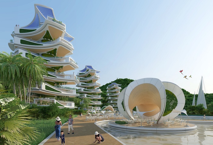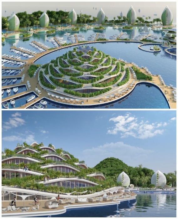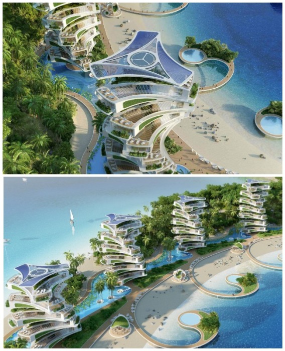 ♦ Гора оригами. В центре лагуны планируют обустроить настоящий научно-исследовательский центр и базу отдыха для сотрудников. Его фасад, покрытый волнообразными балконами, разворачивающимися подобно гигантским оригами утопает в зелени. На крыше здания-горы предусмотрены огороды и органические сады, где не только будут проводить селекционную работу, но и выращивать овощи, фрукты и зелень для нужд ресторанов эко-курорта. Внутри искусственной горы предусмотрены лаборатории, учебные и демонстрационные классы, конференц-залы, спортивный бассейн и бассейн для отдыха с морской водой. Все эти зоны будут в открытом доступе, чтобы побудить обычных туристов взаимодействовать с учеными и исследователями. Здесь также планируют открыть начальную школу и дошкольное учреждение для детей сотрудников/инвесторов, медицинский центр, тренажерный зал и многое другое.