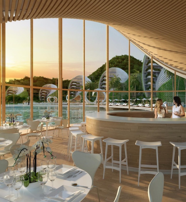 В ресторанах планируют подавать блюда, приготовленные из выращенных на территории курорта овощей, фруктов и рыбы (концепт эко-курорта Nautilus). | Фото: architectmagazine.com.
