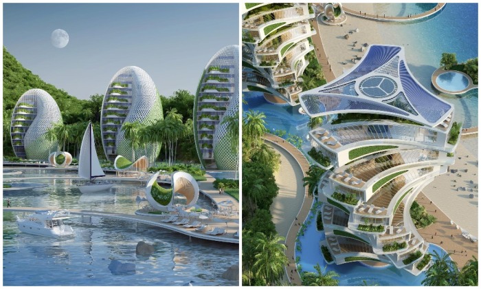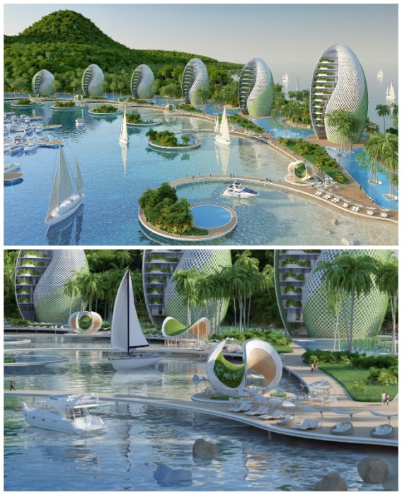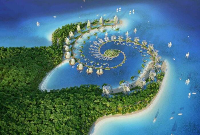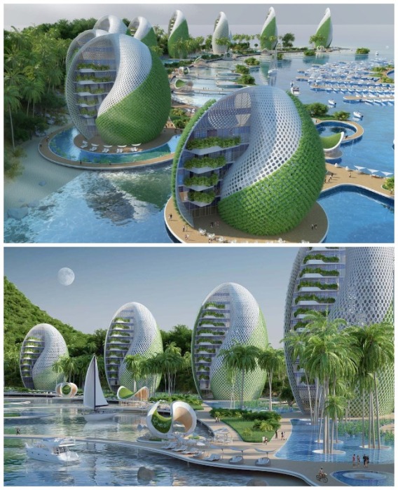 Футуристические формы, пышная зелень и голубые воды лагуны порадуют любителей неординарного отдыха (концепт эко-курорта Nautilus).
