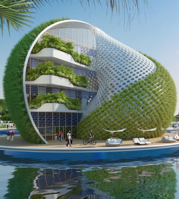 Отельные корпуса в виде ракушек, покрытых зеленью за 24 часа, смогут совершать полный оборот вокруг своей оси (концепт эко-курорта Nautilus). ♦ Зеленые ракушки. На западе курорта предусмотрено 12 небольших отелей-бутиков в форме морских ракушек, появляющихся из воды. На нижних этажах каждого из них планируют разместить выставочные залы, рассказывающие об экологических и социокультурных проблемах архипелага. Биоцементная конструкция этих объектов имеет вид трехмерной спирали, ниши которой будут заселены живыми микроорганизмами, формирующими «экоскелет». А балконы планируют засадить редкими экзотическими растениями.