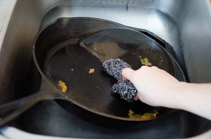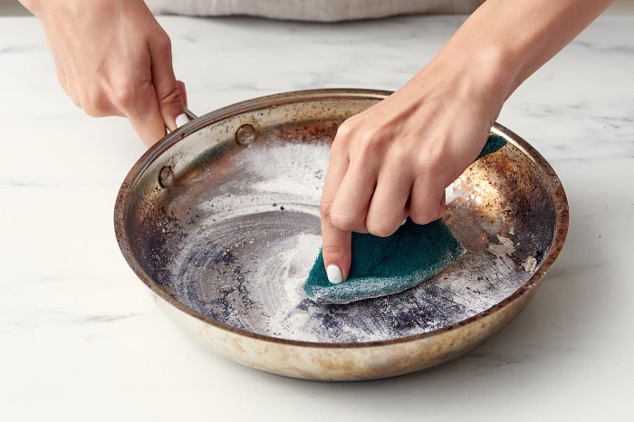 Насыпьте соду на дно сковороды и почистите губкой. / Фото: posudaguide.ru