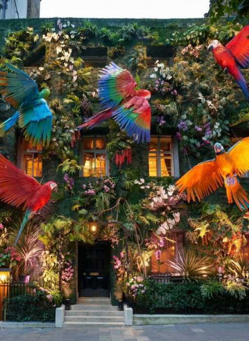 Известнейший частный клуб Annabel’s, куда путь открыт лишь избранным, вначале осени превратился в благоухающий сад. Вернее сказать, его фасад утопает в буйной зелени и цветах, среди которых «порхают» гигантские попугаи. Живописная арт-композиция в стиле экзотических джунглей украшает старинный особняк Георгианской эпохи, расположенный на площади Беркли – в одном из самых престижных районов Лондона.