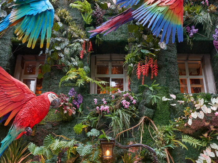 Фасад известнейшего элитного клуба Лондона превратили в тропический рай с гигантскими папоротниками и яркими попугаями (Annabel’s, Великобритания). | Фото: protecttheresults.com.